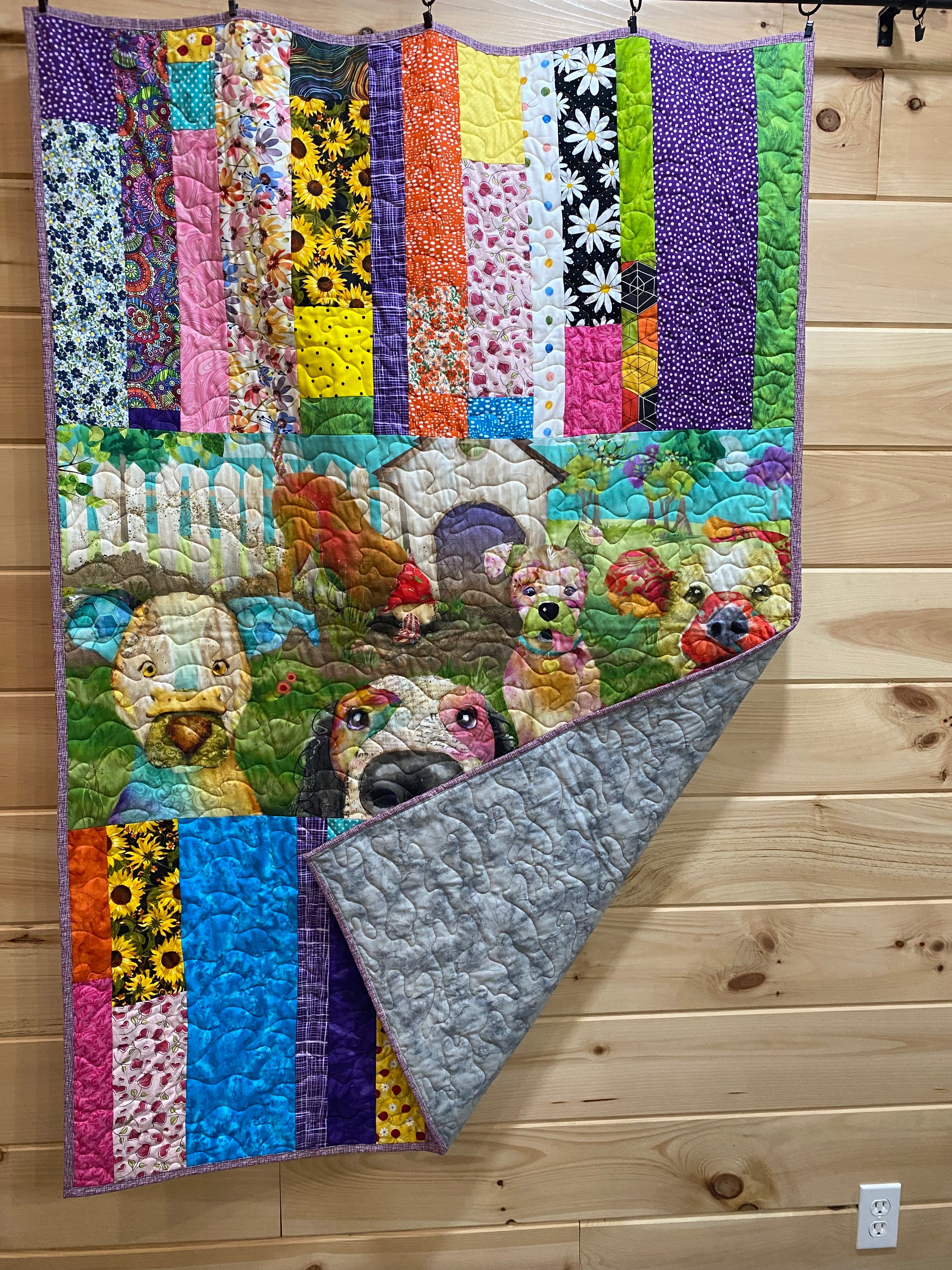 Bring a smile to your space with this bright and joyful handmade quilt featuring a group of playful, happy dogs surrounded by a garden backdrop. The center dog panel bursts with personality, while the patchwork borders of colorful floral, geometric, and whimsical prints add even more charm and energy.