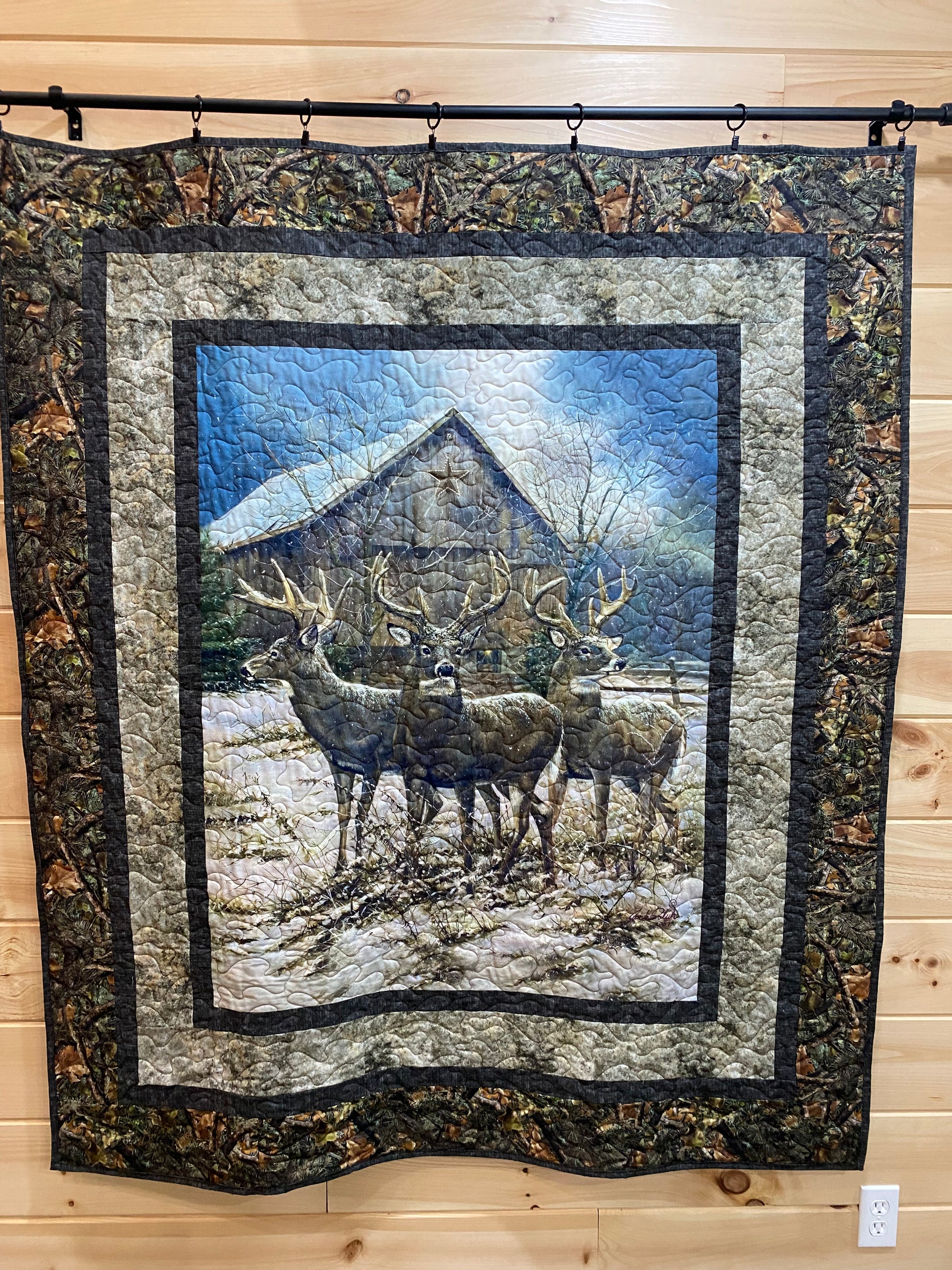 Bring the peaceful beauty of the outdoors into your home with this stunning handmade deer quilt. The centerpiece features a lifelike scene of majestic bucks standing before a weathered barn on a winter’s day, perfectly framed with layers of coordinating earthy camo and forest-inspired borders.